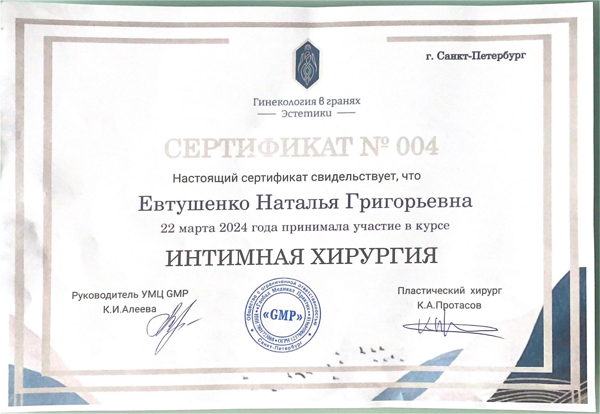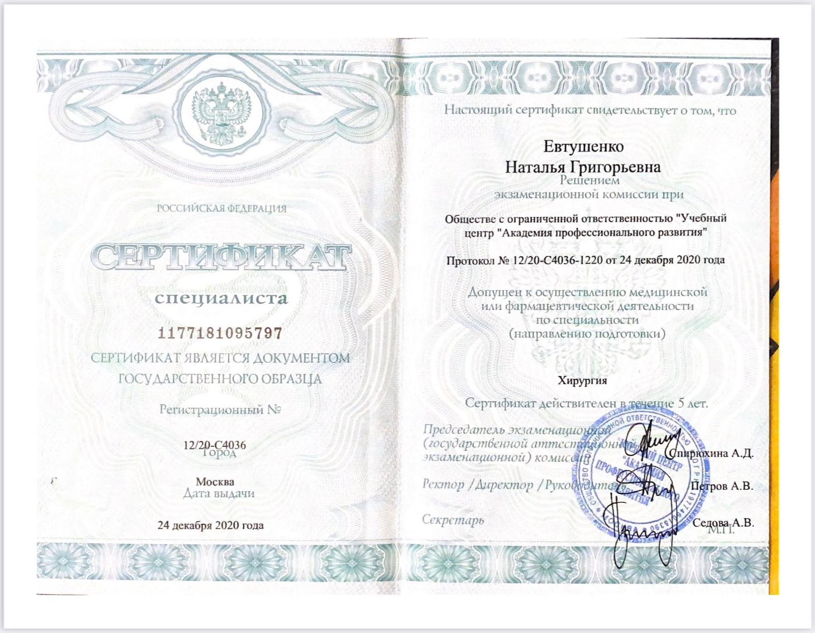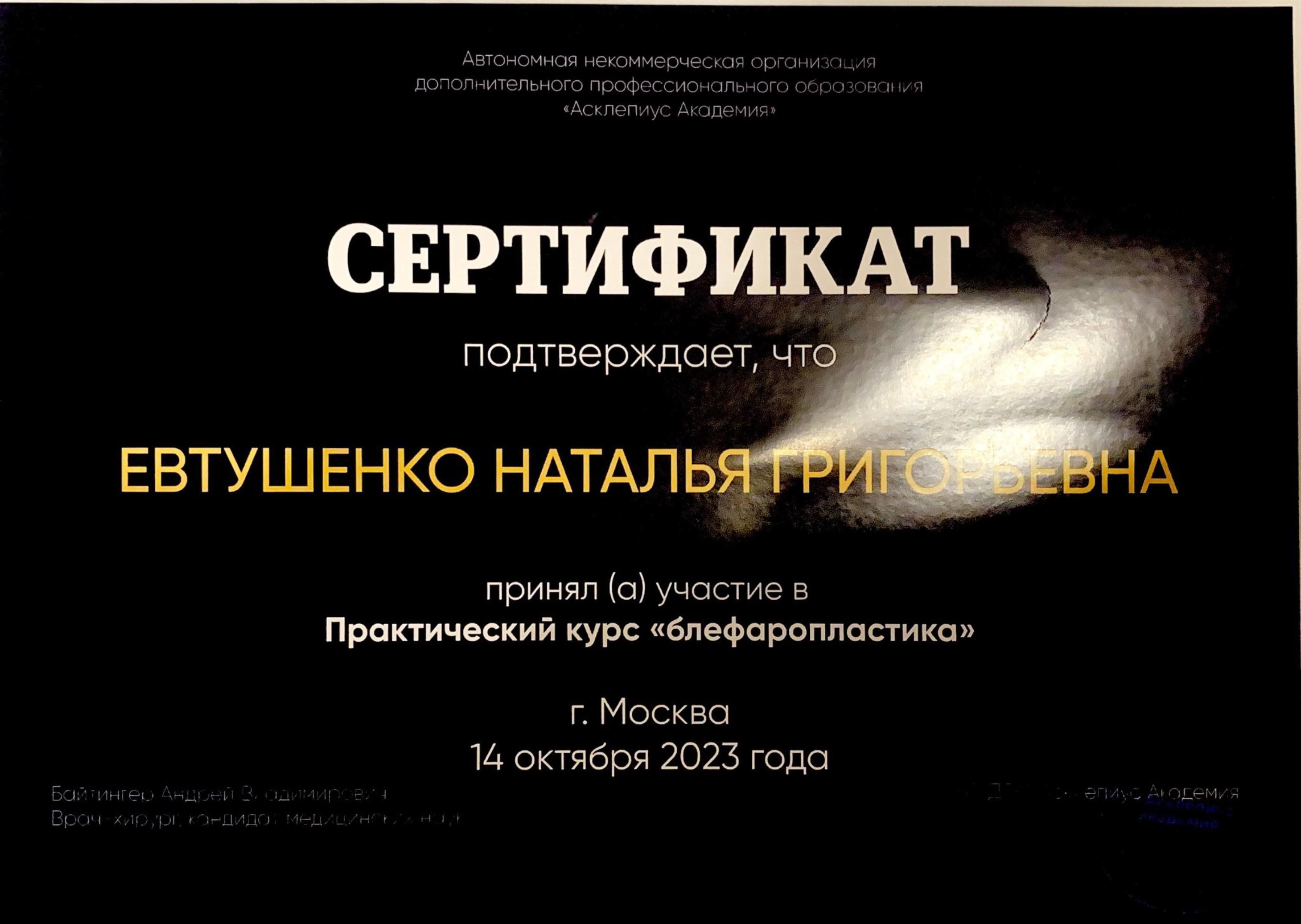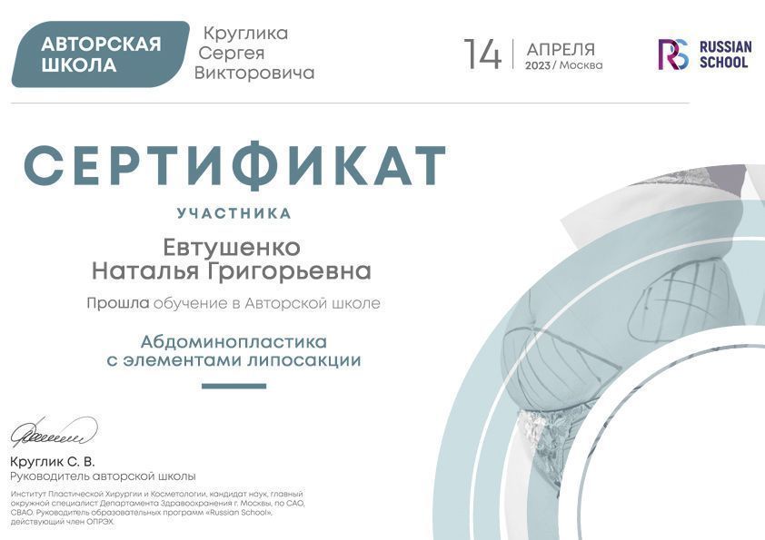 - Июнь-август 2022, Москва, обучение по программе «АБДОМИНОПЛАСТИКА» под руководством Борисенко А.С.