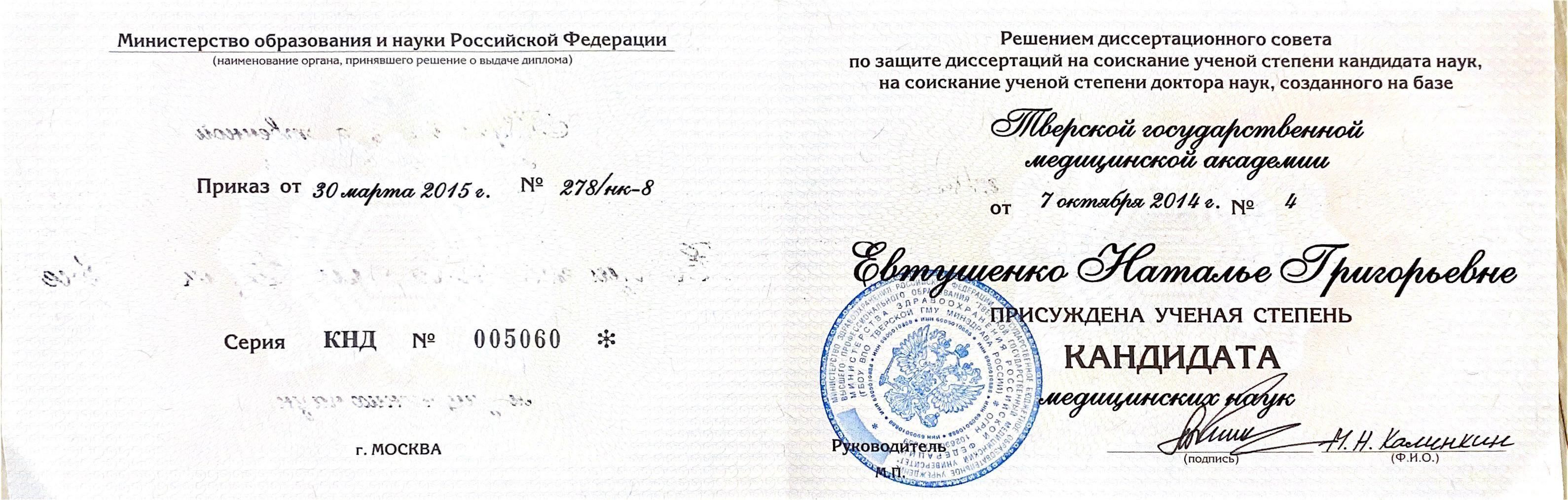 2014, Тверская государственная медицинская академия, заочная аспирантура на кафедре общей хирургии, тема научной работы: «Использование биологически активного шовного материала при хирургическом лечении грыж передней брюшной стенки» (научный руководитель – проф. Мохов Е.А.)