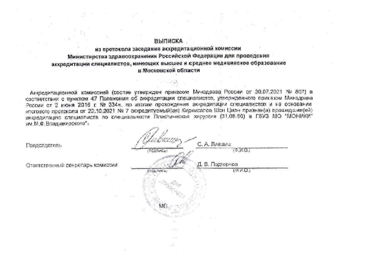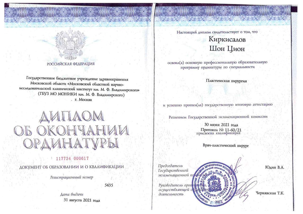 2021 г. Ординатура по специальности "Пластическая хирургия", Государственное бюджетное учреждение здравоохранения «Московской области научно- исследовательский клинический институт им. М.Ф. Владимирского» (ГБУЗ МО МОНИКИ им. М.Ф. Владимирского) г. Москва