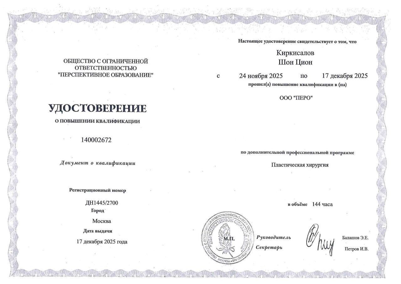 Киркисалов Шон Цион специализируется на реконструктивно-пластических операциях лица и тела. Освоил технологию бодимоделирования, успешно применяет технологию липофилинга ягодиц, молочных желез, лица и кистей. Выполняет амбулаторные хирургические операции: удаление липом, атером, хирургическое, терапевтическое лечение рубцов, а также методом местной пластики и лазерной шлифовки.