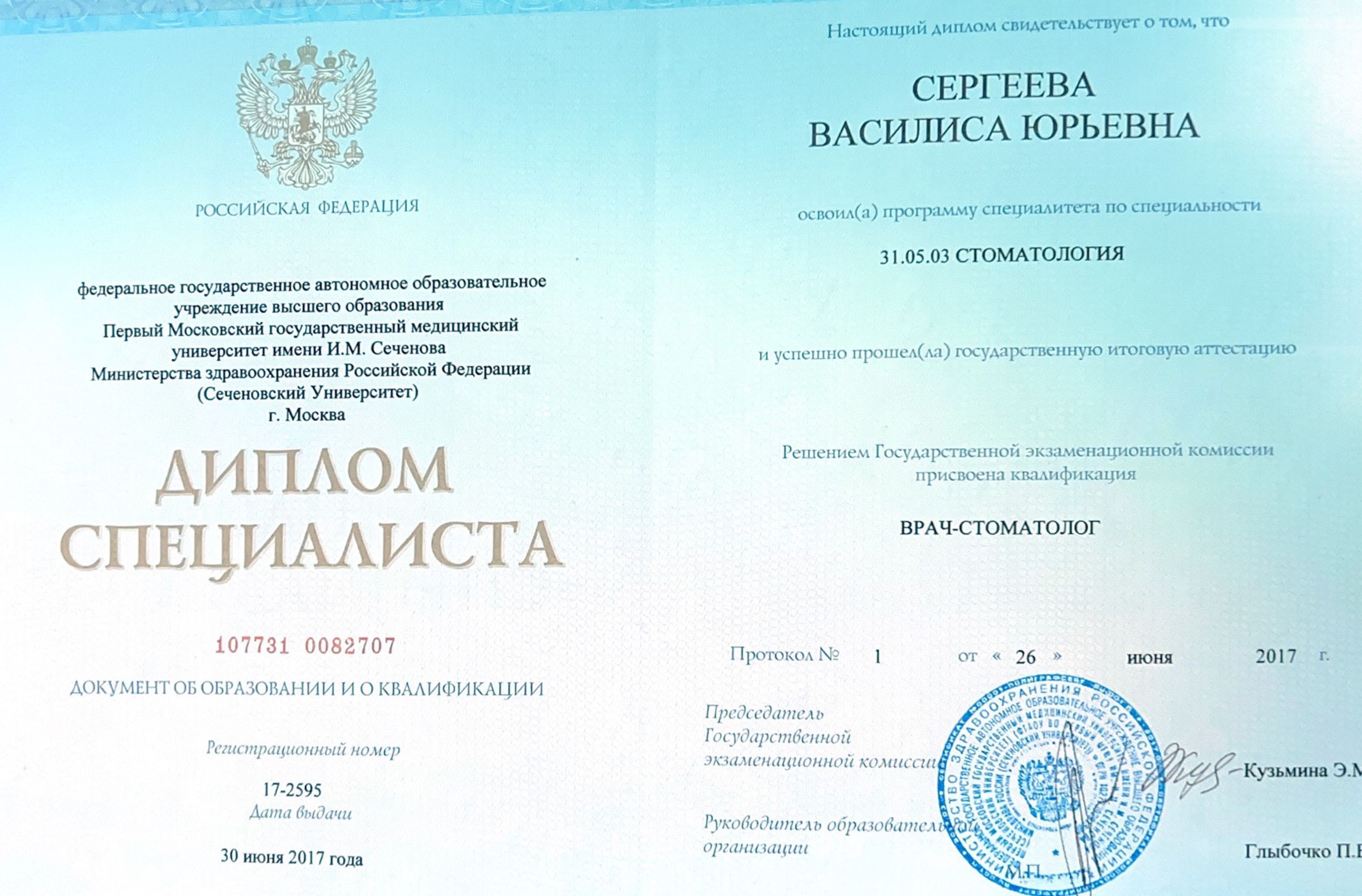 2017 г. ПМГМУ им. Сеченова, специальность "Стоматология"