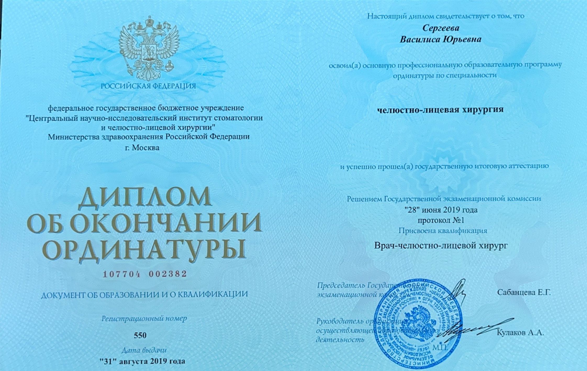 2019 г. Ординатура «ЦНИИС и ЧЛХ» по специальность «Челюстно-лицевая хирургия»