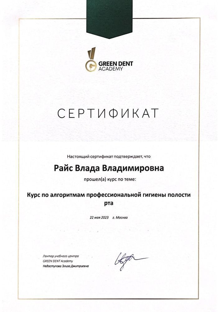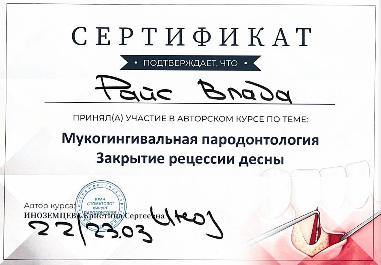 Райс Влада Владимировна — врач-стоматолог, специализирующийся на сохранении зубов и лечении заболеваний пародонта и слизистых оболочек. В своей практике особое внимание уделяет точной диагностике, составлению индивидуальных планов лечения и обучению пациентов грамотному уходу за полостью рта. Подбирает эффективные средства и помогает сформировать устойчивые гигиенические привычки.