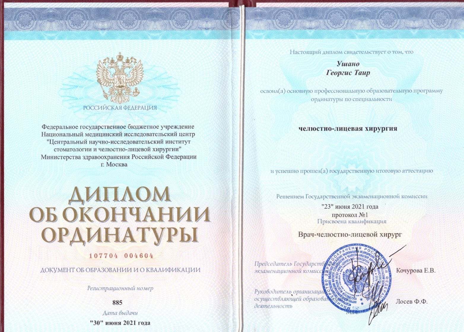 2021 г. Ординатура в НМИЦ «Центральный научно-исследовательский институт стоматологии и челюстно-лицевой хирургии» по специальности «челюстно-лицевая, пластическая и эстетическая хирургия»